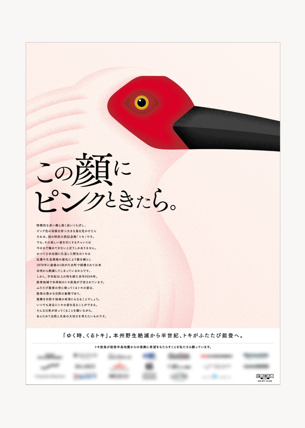 2026年に能登地域で予定されているトキの放鳥を広く周知し、石川・能登の豊かな自然をあらためて考える機会を提起する協賛広告の企画・制作を担当しました。トキの特徴的な顔のイラストとキャッチコピーで読者の目を引き、伝えたいメッセージへと導くことを意図しています。